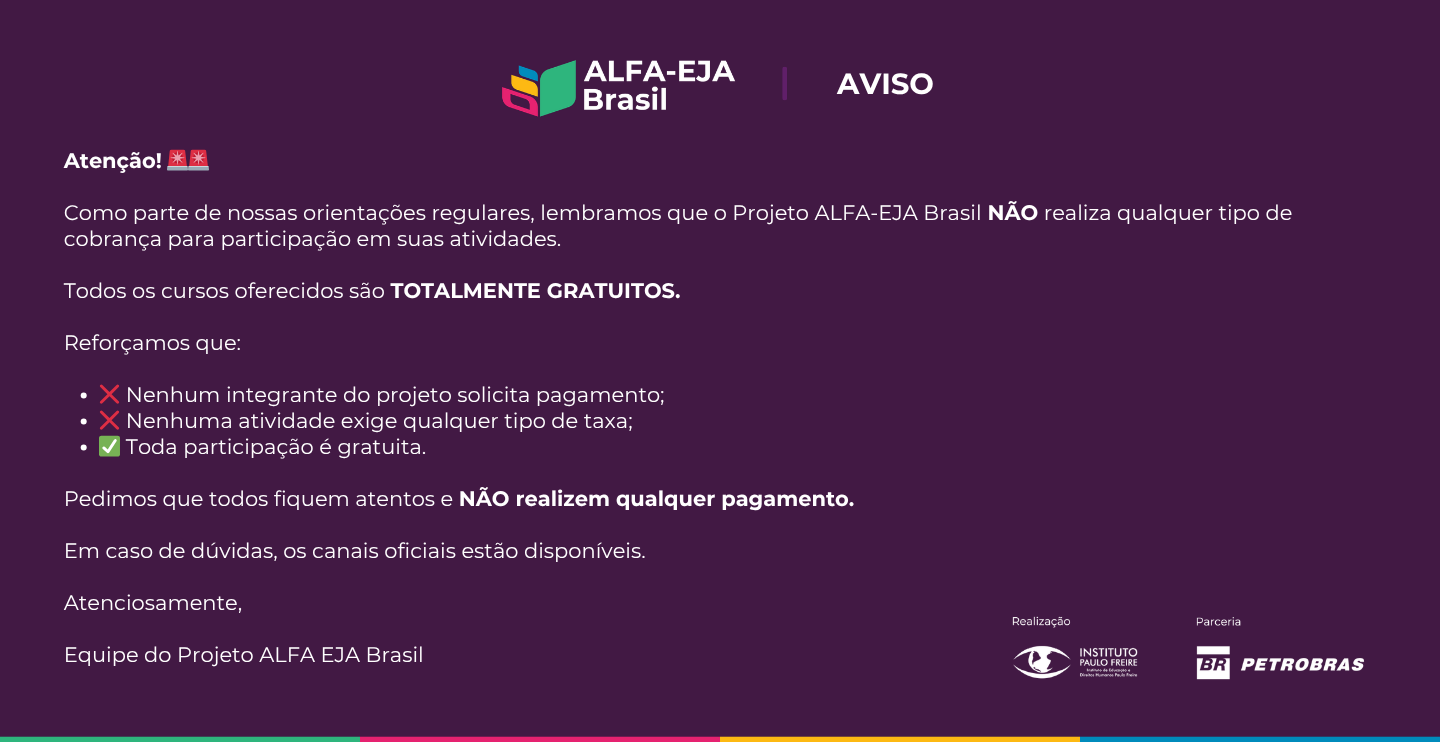 O Projeto ALFA-EJA Brasil é uma iniciativa do Instituto de Educação e Direitos Humanos Paulo Freire, realizada em parceria com a Petrobras. Sua base metodológica é a pedagogia freiriana — uma abordagem criada por Paulo Freire que reconhece e valoriza as vivências de cada educando. Em vez de impor saberes prontos, o projeto promove o diálogo, a escuta ativa e a construção coletiva do conhecimento, conectando a alfabetização à realidade, à cultura e aos sonhos de cada pessoa.